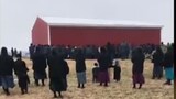 Här lyfter Amishpersoner en lada